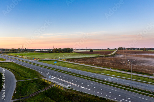 © smiltena, Fototapeta premium Aerial view of a highway passing through agricultural fields at sunrise