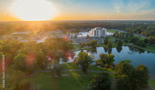 © Zenstratus, Fototapeta premium Aerial view of a hospital complex Fairview Park, Dublin, Georgia, USA. The building is surrounded by trees, a pond, and parking lots. The sun is setting in the distance.