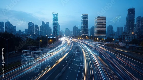 Fototapeta premium Aerial view of a hyper connected smart city skyline at night with skyscrapers highways and traffic lights creating a dynamic futuristic landscape