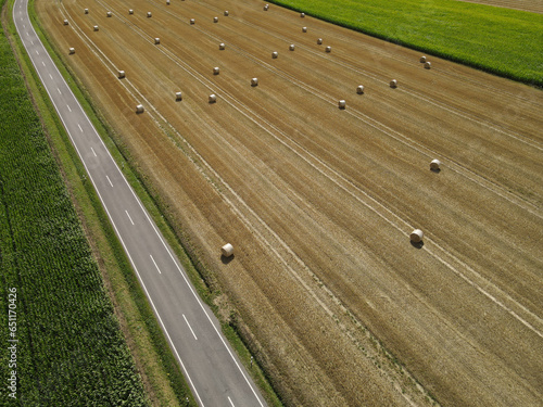 © Mentor, Fototapeta premium Aerial view of a landscape with a road between a cornfield and a grass field with hay bales