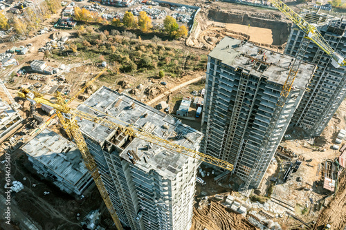 Obraz premium aerial view of a large construction site with buildings under construction and tower cranes.