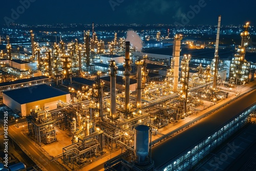 © Awwalun, Fototapeta premium Aerial view of a large industrial complex at night, illuminated by lights from numerous structures