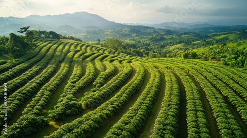 Obraz premium Aerial view of a lush coffee plantation, with rows of green coffee plants...