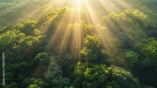 © Azahrul, Obraz premium Aerial view of a lush forest illuminated by sunlight beams.