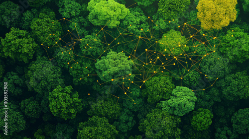 Fototapeta premium Aerial view of a lush forest with interconnected glowing points and lines,...