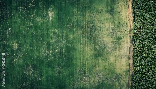 © Pumapala, Obraz premium Aerial view of a lush green field bordered by a dense forest.