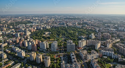 © IbragimovN, Fototapeta premium Aerial view of a lush urban park surrounded by city buildings at sunset