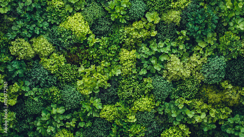Naklejka premium Aerial view of a lush young green forest in vibrant spring or summer symbolizing renewal growth vitality and interconnected chaos of nature viewed from above with dense treetop patterns