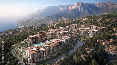Obraz premium Aerial View of a Luxury Resort in a Mountainous Coastal Setting