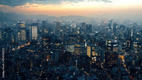 Obraz premium Aerial view of a modern city skyline at dusk, skyscrapers glowing under the...
