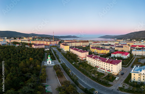 © Andrei Stepanov, Fototapeta premium Aerial view of a northern seaside town. Top view of the streets, buildings and the chapel. In the distance the sea bay and mountains. Beautiful morning cityscape. Magadan city, Magadan Region, Russia.