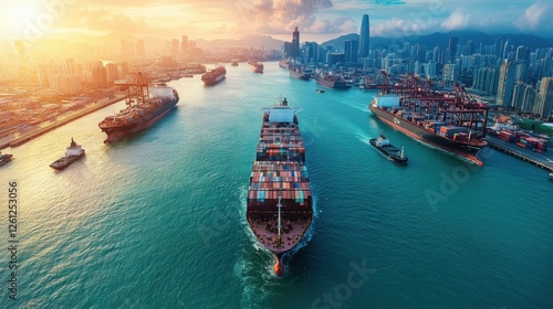 © Pat J., Obraz premium Aerial view of a port with cargo ships and cranes, highlighting international trade
