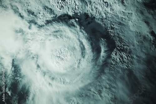 © Puchong, Obraz premium Aerial view of a powerful cyclone swirling over the ocean. Dramatic weather phenomenon captured from above, showcasing the storm's intense energy and chaotic beauty.
