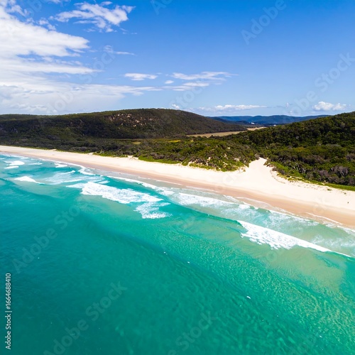 © Lailatul, Obraz premium Aerial view of a pristine beach with turquoise water and lush green hills