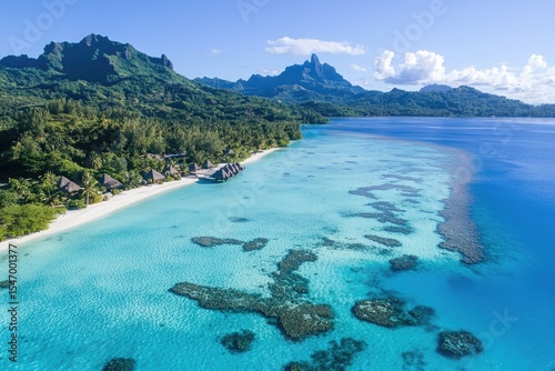 © IQRAM, Fototapeta premium Aerial view of a pristine beach with turquoise water, lush greenery, and distant mountains