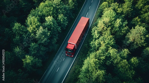 © savior, Fototapeta premium Aerial view of a red truck driving on the road in the forest