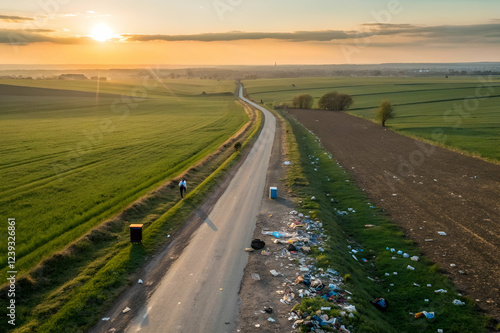 Naklejka premium Aerial View of a Rural Road at Sunset with a Littered Landscape