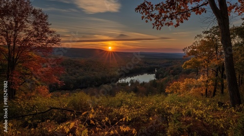 © miss irine, Fototapeta premium Aerial view of a serene autumnal landscape in Pocono Mountains. River flows gently past old stone buildings with a backdrop of vibrant fall foliage. Scenic view of lake and surrounding trees