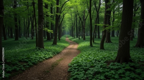 © Cloudy, Fototapeta premium Aerial View of a Serene Forest Pathway Surrounded by Lush Greenery