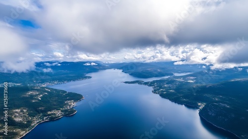 Fototapeta premium Aerial view of a serene lake surrounded by lush forests and clouds in a...