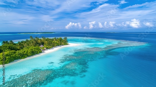 © CryptoCanvas, Obraz premium Aerial view of a serene tropical island showcasing pristine beaches and vibrant turquoise waters under a clear blue sky