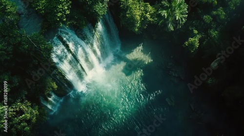 Obraz premium Aerial view of a serene waterfall in lush forest.