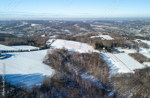 Obraz premium Aerial view of a serene winter landscape with snow-covered hills and bare...