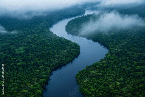 © Adi, Fototapeta premium Aerial View of a Serpentine River Through Lush Green Jungle Canopy