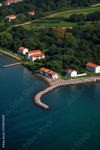 © haiqiang, Fototapeta premium aerial view of a small island with a lighthouse and a house
