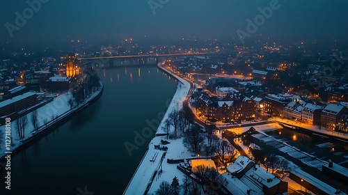 © Tcukimay, Fototapeta premium Aerial view of a snow-covered city at twilight, with a river winding through it, illuminated by warm lights.