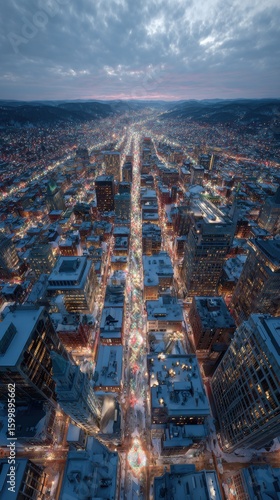 Obraz premium Aerial view of a snowy city glowing with warm holiday lights at dusk with traffic and festive ambiance perfect for winter celebration visuals and New Year season campaigns