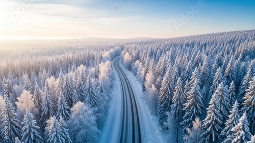 © phj.domingos, Naklejka premium Aerial view of a snowy forest with a winding road during winter