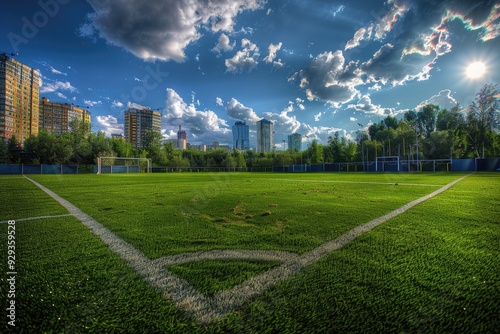 © Fotograf, Obraz premium Aerial view of a soccer field with a city skyline in the background, perfect for urban sports or lifestyle themes
