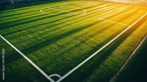© AURA COLLECTIONS, Obraz premium Aerial view of a soccer field with long shadows at sunset.
