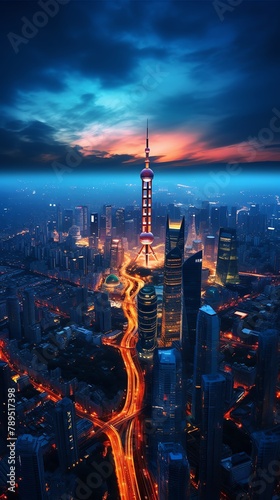 © Cheetose, Fototapeta premium Aerial view of a sprawling city at dusk, showcasing glowing streets and illuminated skyscrapers, representing urban development and smart city technology