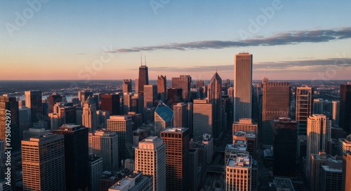 Fototapeta premium Aerial view of a sprawling metropolitan skyline with towering skyscrapers illuminated by the warm glow of a beautiful sunset