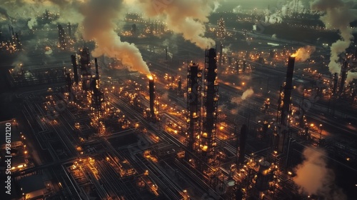 © Georgii, Fototapeta premium Aerial view of a sprawling oil refinery with towering chimneys and glowing lights at dusk, emitting smoke into the sky.