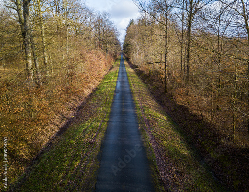 © Thomas Dutour, Fototapeta premium Aerial view of a straight narrow road in a forest in winter