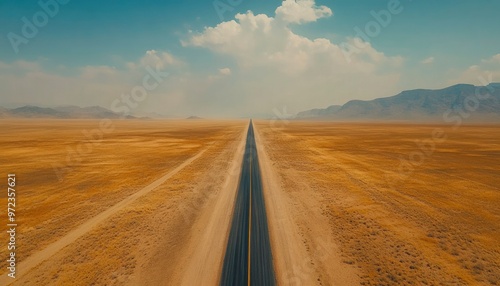 © Outkast, Fototapeta premium Aerial View of a Straight Road Through a Dry Desert Landscape