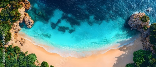 Naklejka premium Aerial view of a stunning tropical beach featuring clear turquoise waters lapping against soft golden sands, surrounded by lush greenery and rocky cliffs.