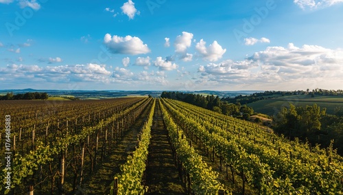 © TheWaterMeloonProjec, Naklejka premium Aerial view of a stunning vineyard on rolling hills under a clear sky