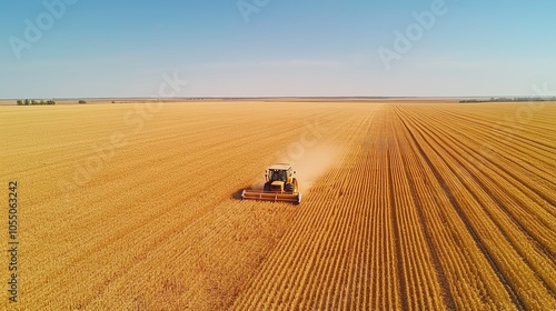 © Theraphol, Fototapeta premium Aerial view of a tractor harvesting crops in a vast golden field under a clear blue sky.