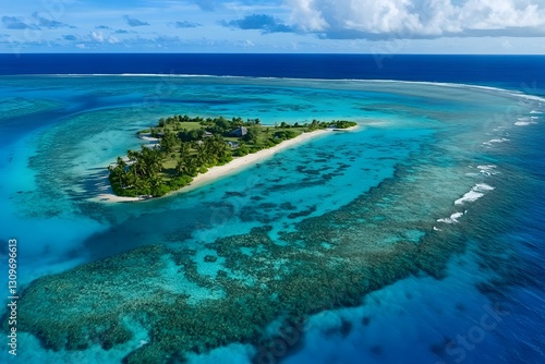 © Bangyuuuu, Obraz premium aerial view of a tropical island surrounded by turquoise waters, coral reefs, and deep blue ocean under a bright sky with clouds.