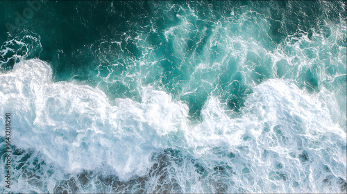 © Jing, Obraz premium Aerial view of a turquoise coastline with abstract wave patterns and blue tones