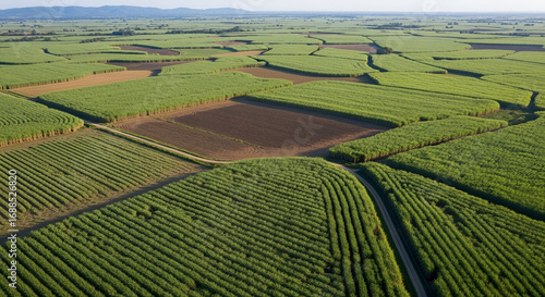 © haris, Fototapeta premium Aerial view of a vast agricultural landscape with cultivated fields and patterns, showcasing a rural environment.