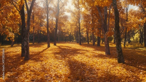 © I Am The Future, Fototapeta premium Aerial view of a vibrant autumn forest with golden leaves and soft sunlight.