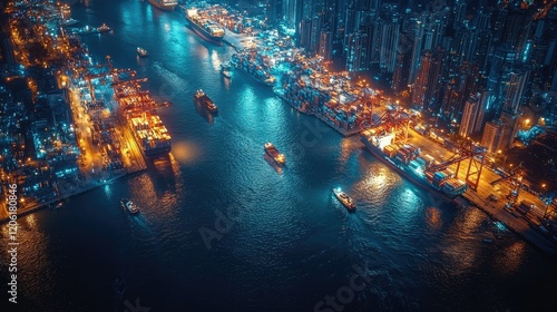Obraz premium Aerial view of a vibrant city harbor at night, illuminated by colorful lights...