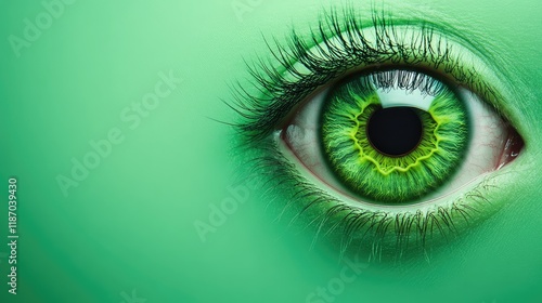 © ArtificialHorizons, Fototapeta premium Aerial view of a vibrant green human eye with intricate details and ample copyspace for creative text placement