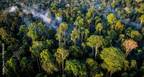 © Abstrak, Fototapeta premium Aerial view of a vibrant rainforest canopy with morning mist rising