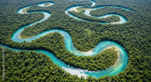 © Meow Creations, Fototapeta premium Aerial view of a winding blue river meandering through a dense tropical rainforest